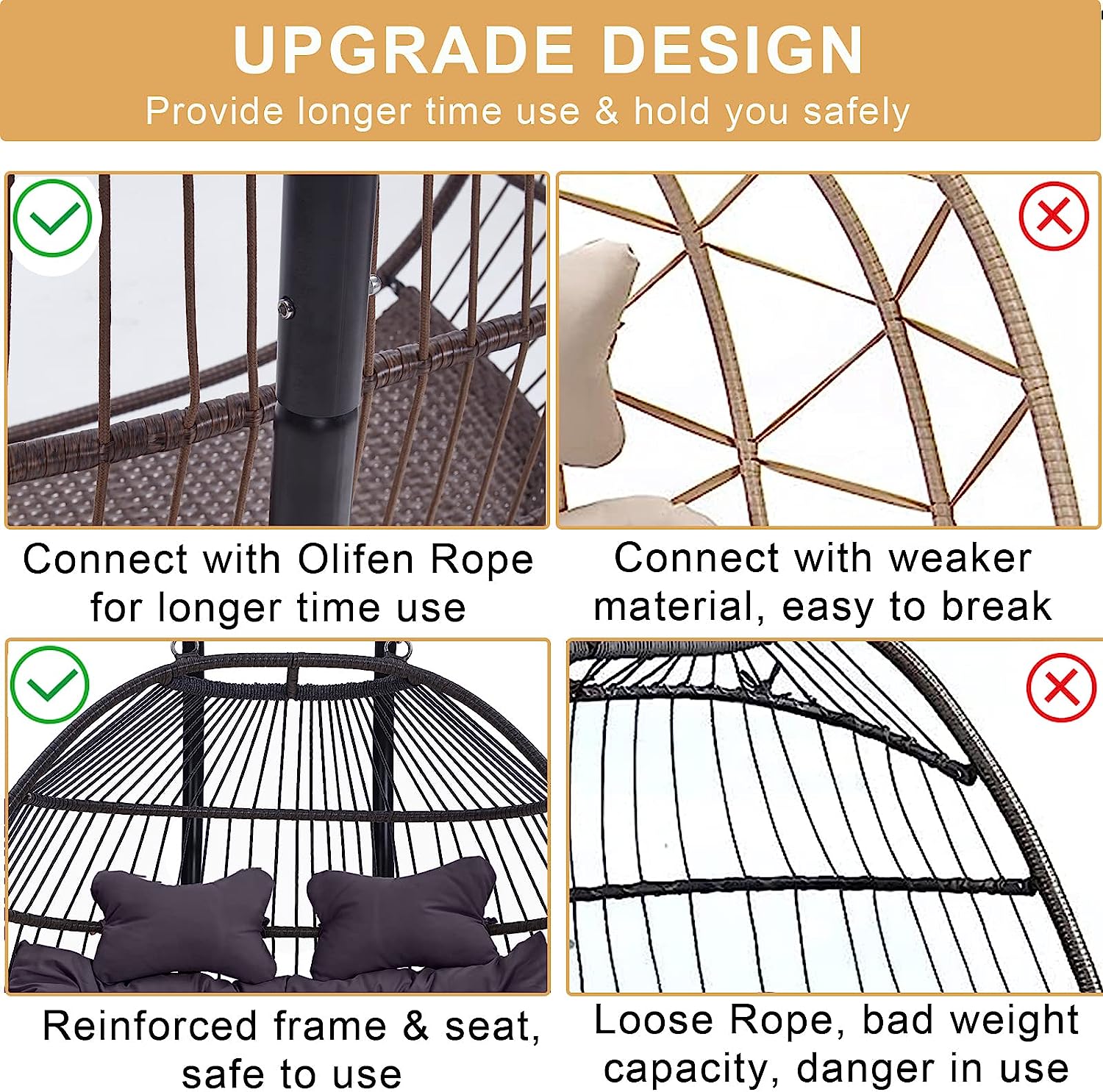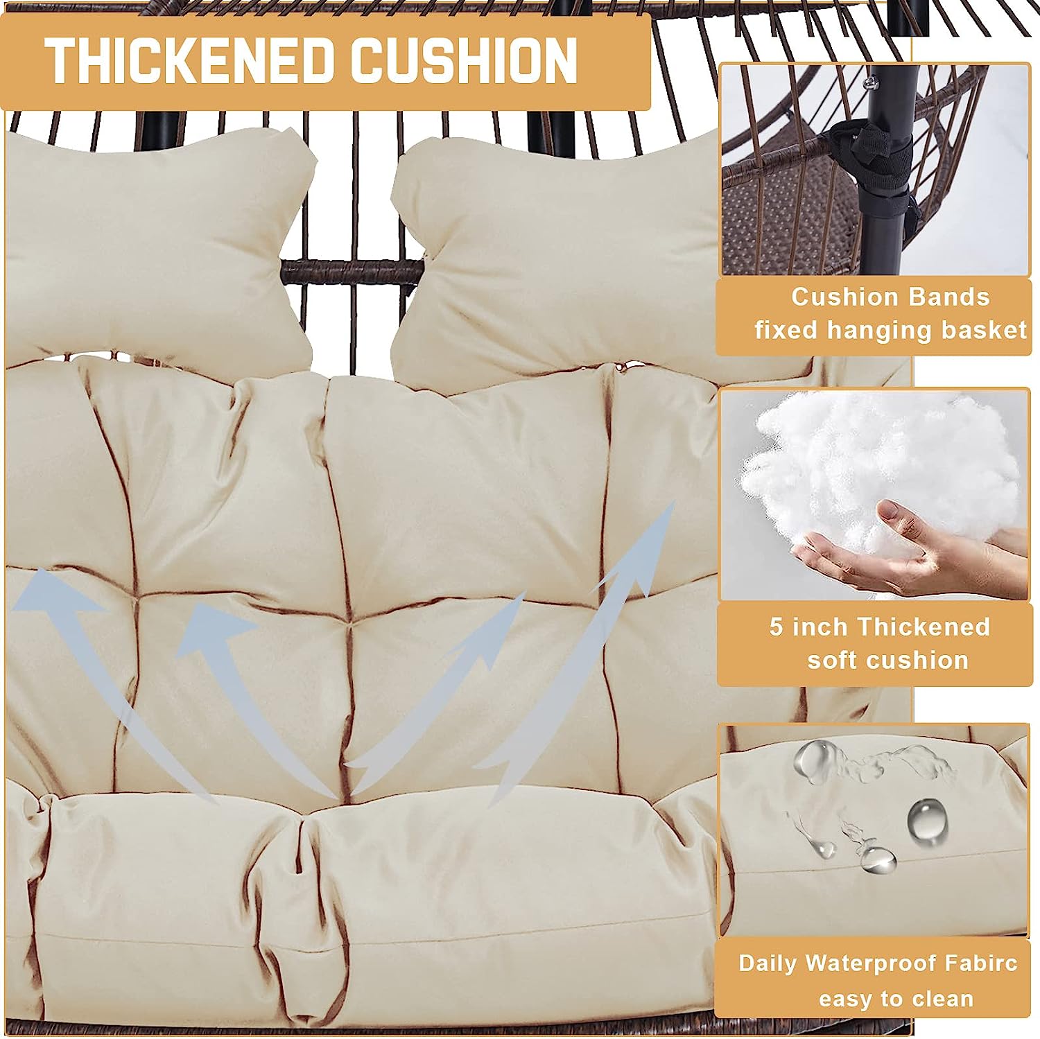 Hanging Egg Chair with Stand, 2 Person Heavy Duty Hanging Wicker Rattan Swing Chair Basket Hammock Nest Chair Seat for Indoor Outdoor Patio Lounger Swinging Loveseat (Beige)