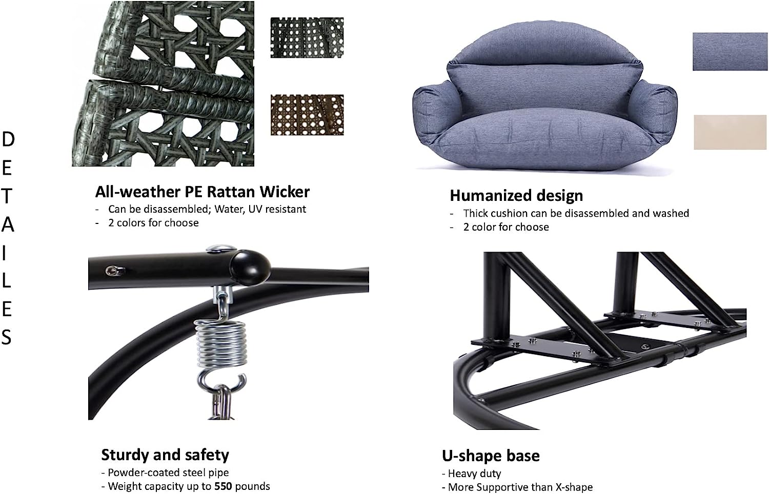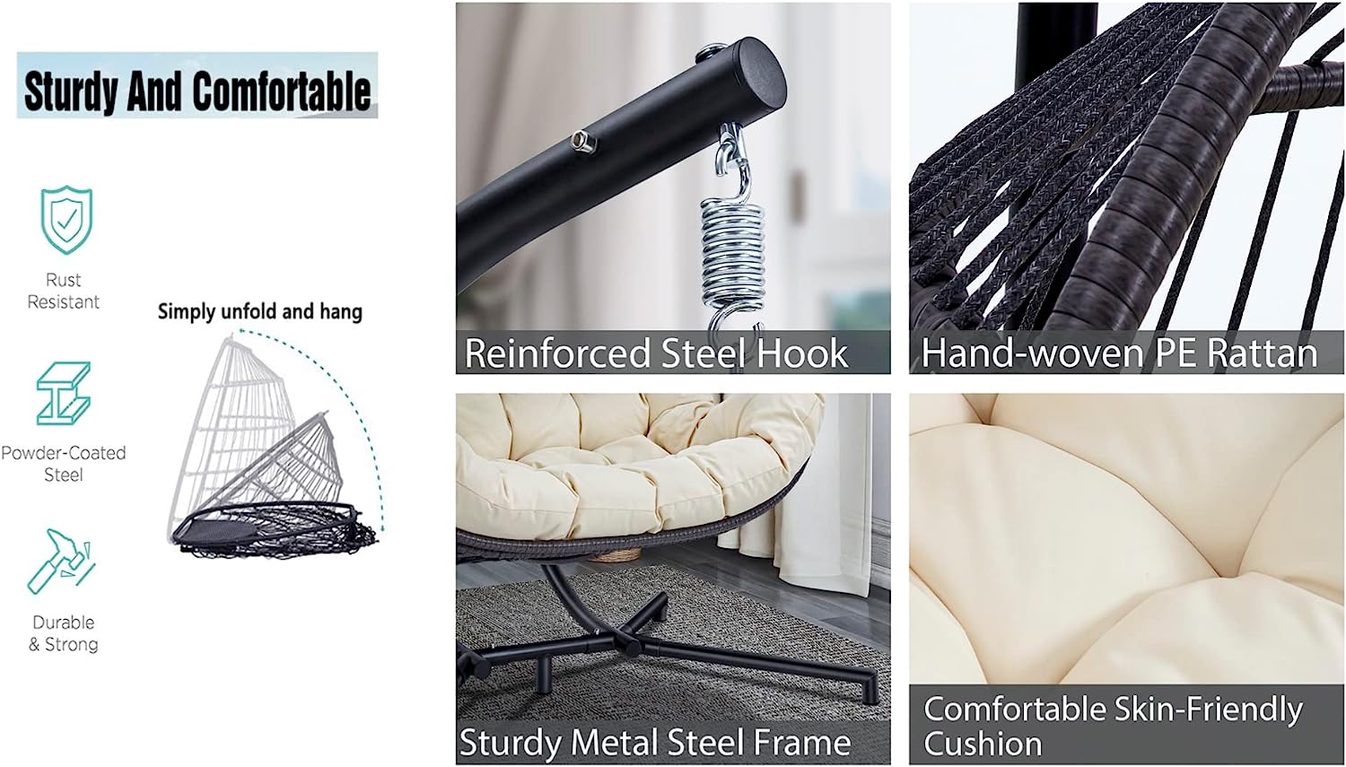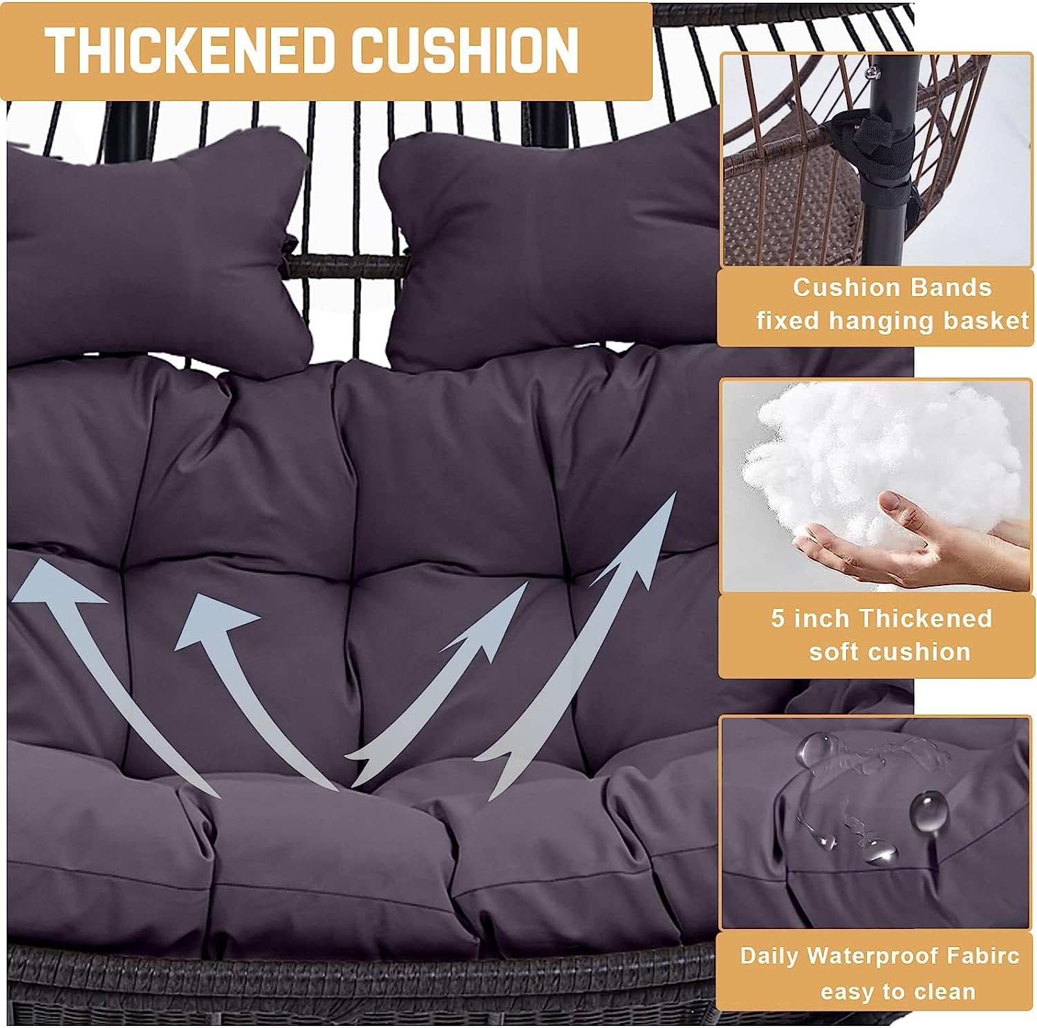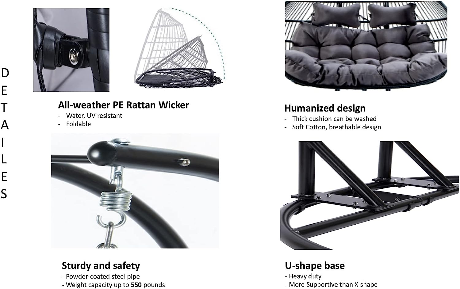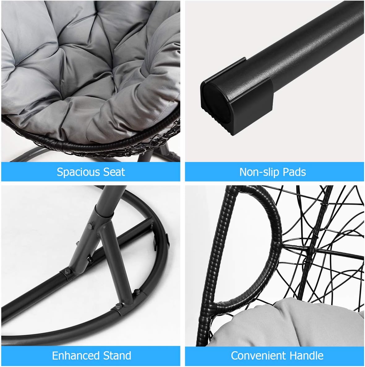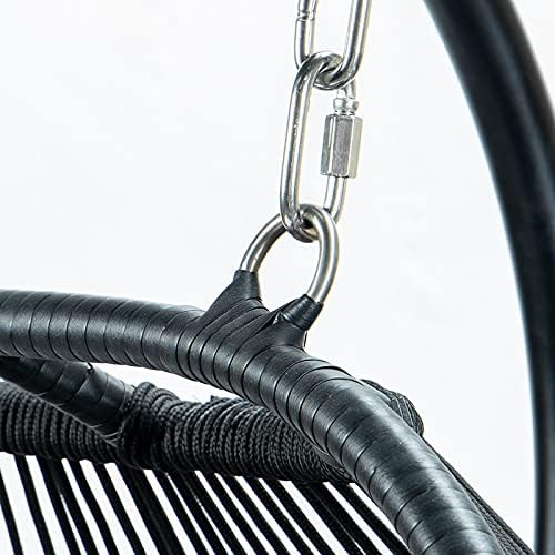 Double Egg Chair with Stand, Foldable 2-Person Hanging Swing Chair with Cover and UV Cushion, X-Large Rattan Wicker Hammock Chair for Indoor Outdoor Garden Patio (Black Frame + Gray Cushion)