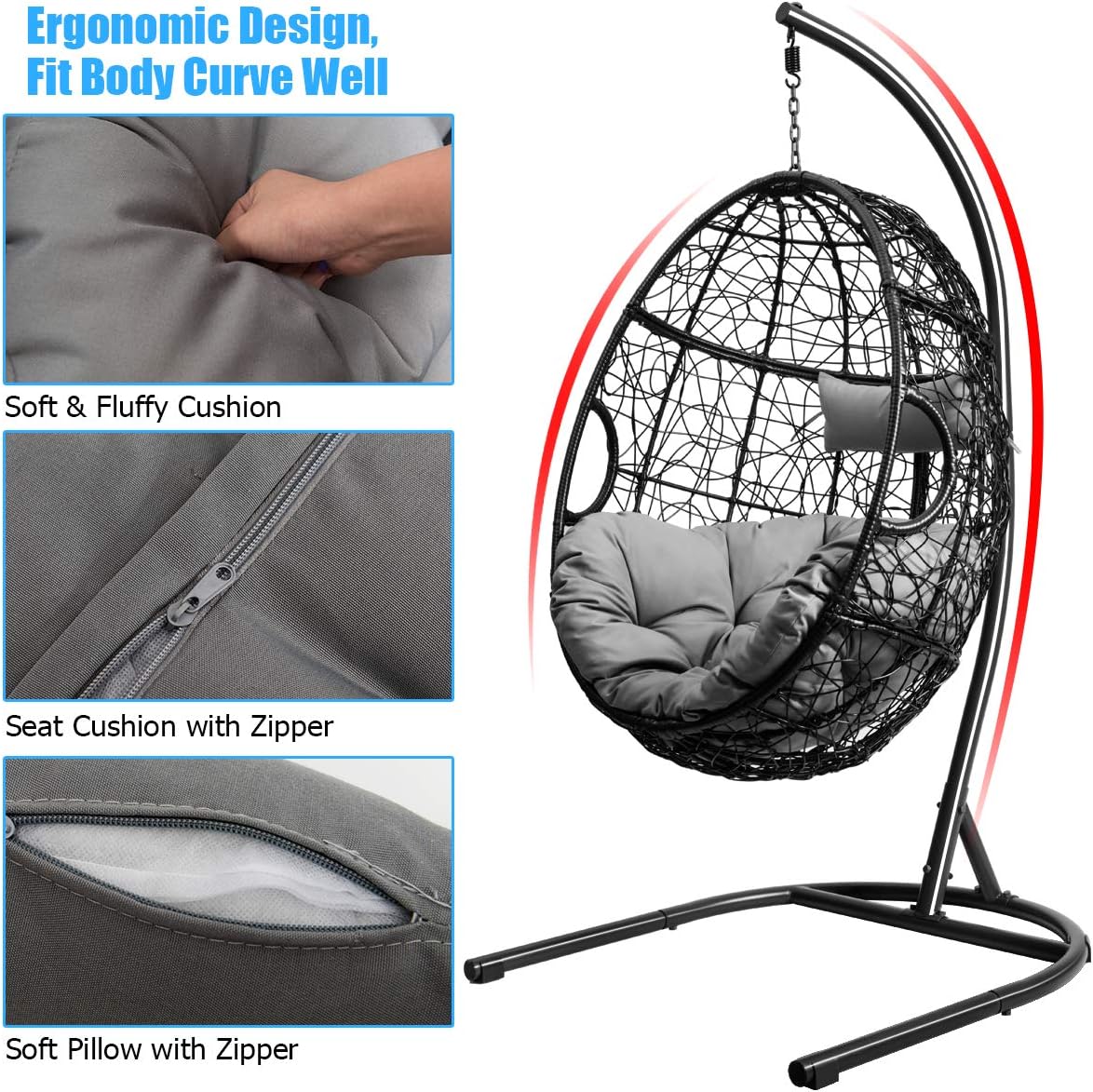 Giantex Hanging Egg Chair, 36.5-Width Oversized Swing Chair with C-Hammock Stand Set, Hammock Chair with Soft Seat Cushion & Pillow, Multifunctional Hanging Chairs for Outdoor Indoor Bedroom (Gray)