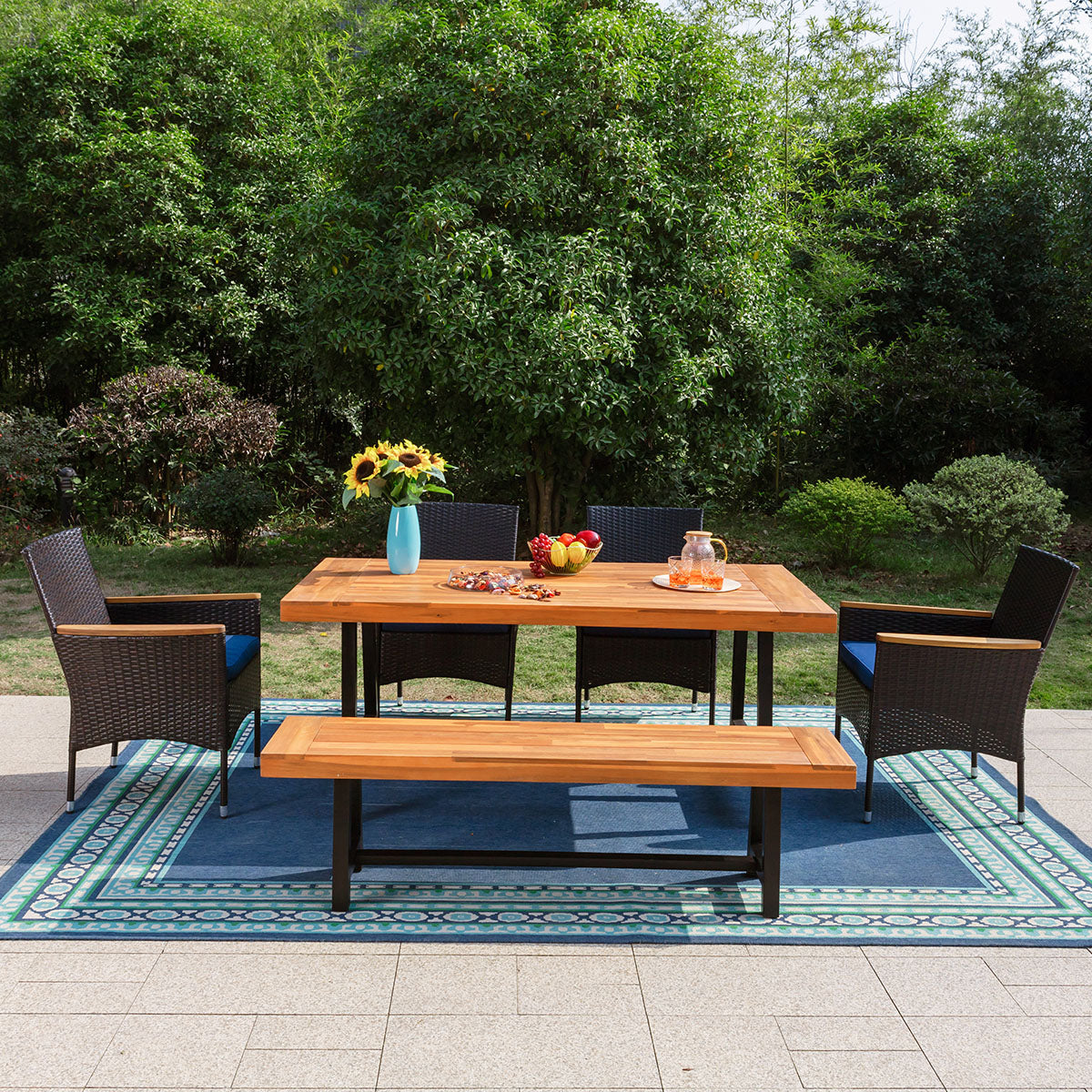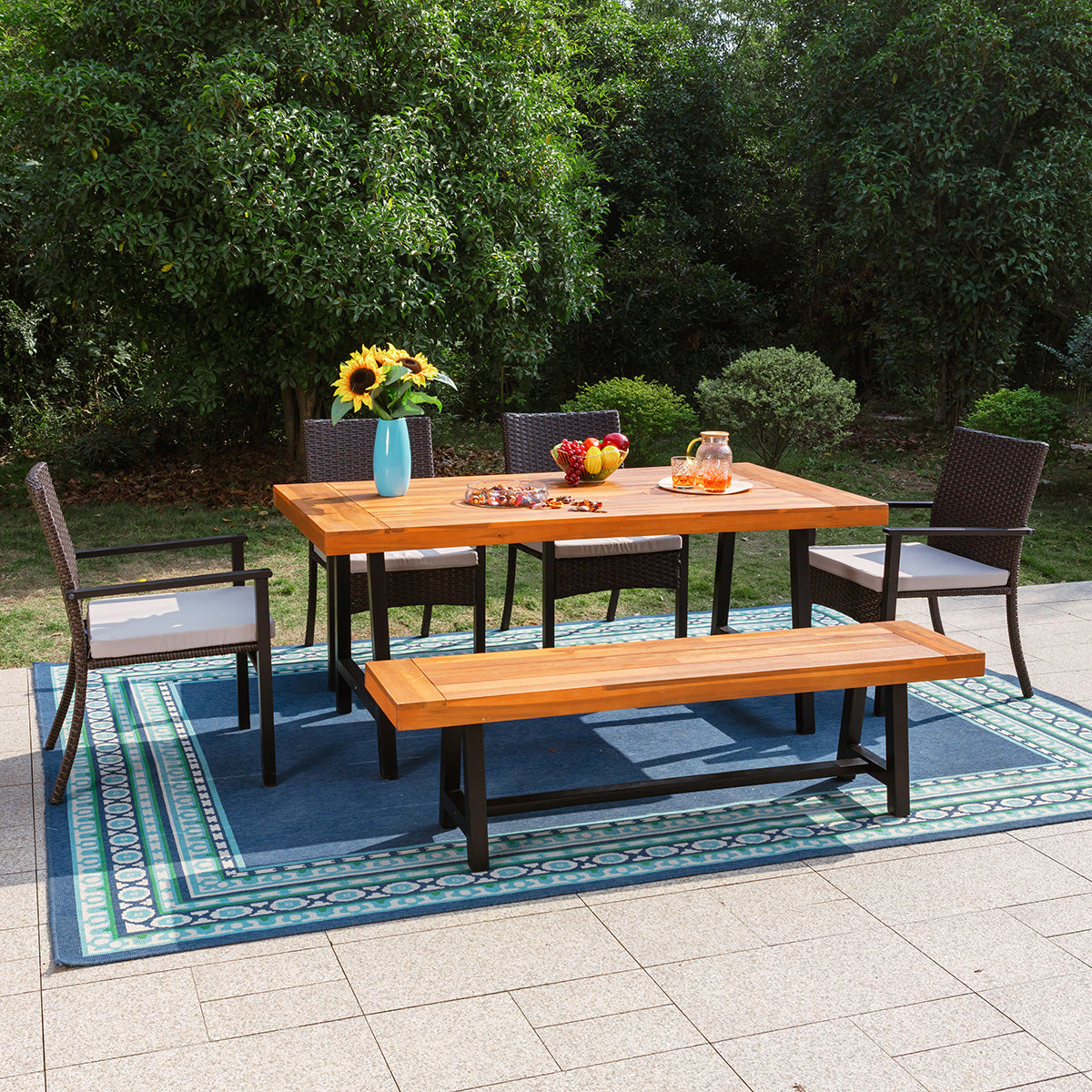 6 Piece Outdoor Dining Set with Acacia Wood Table & Wooden Bench and 4 Cushioned Rattan Wicker Chairs