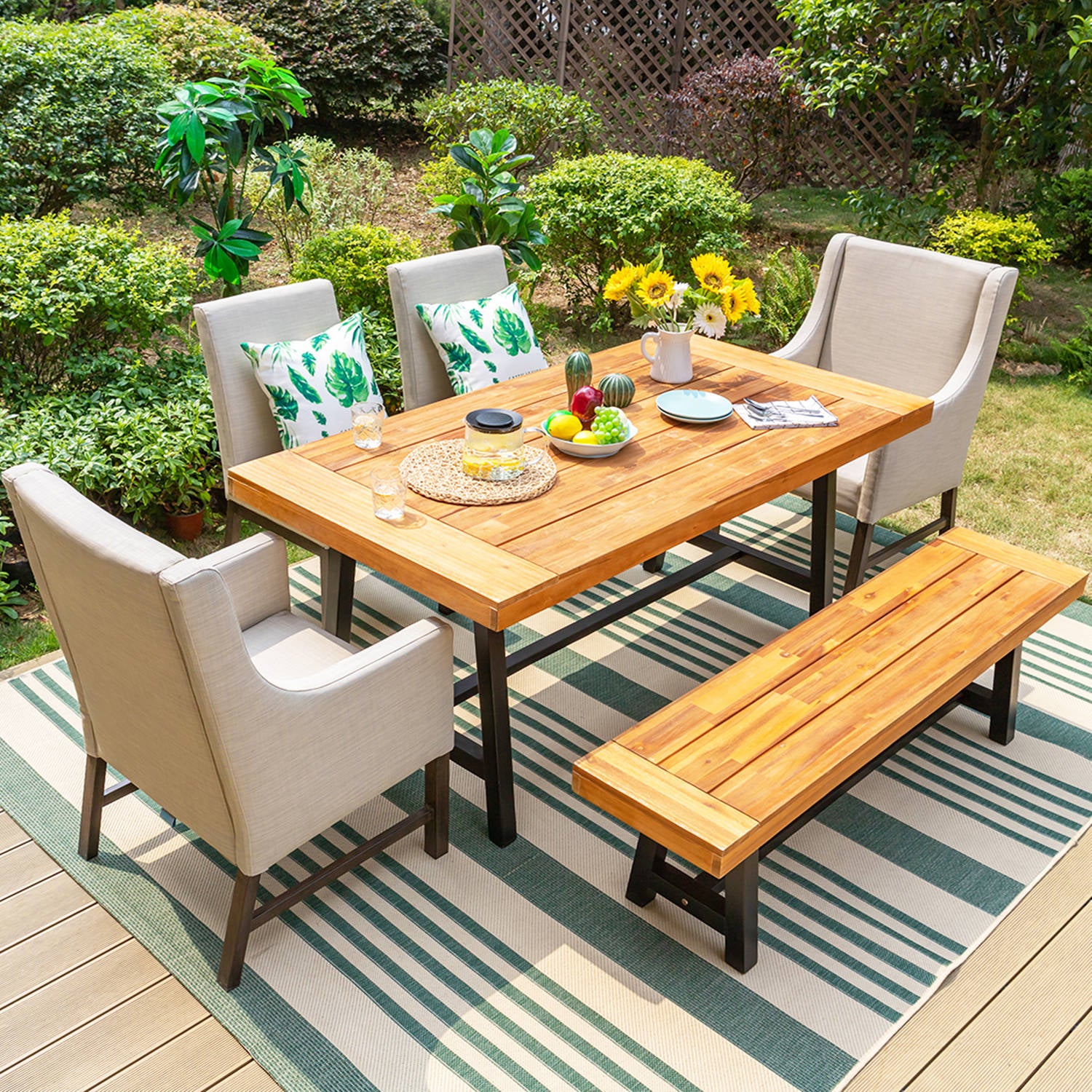 Patio Dining Set with Textilene Chairs/ Acacia Wooden Bench & Acacia Wooden Table