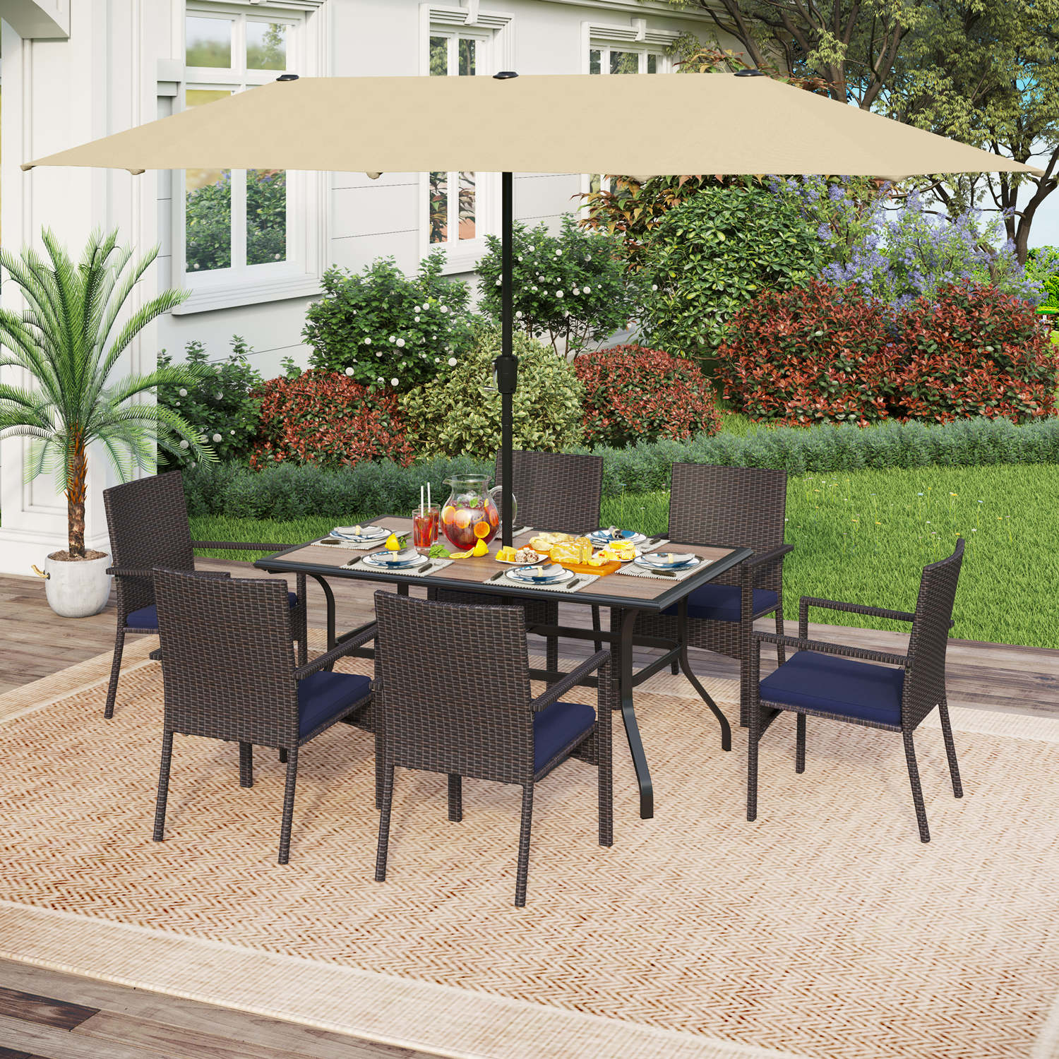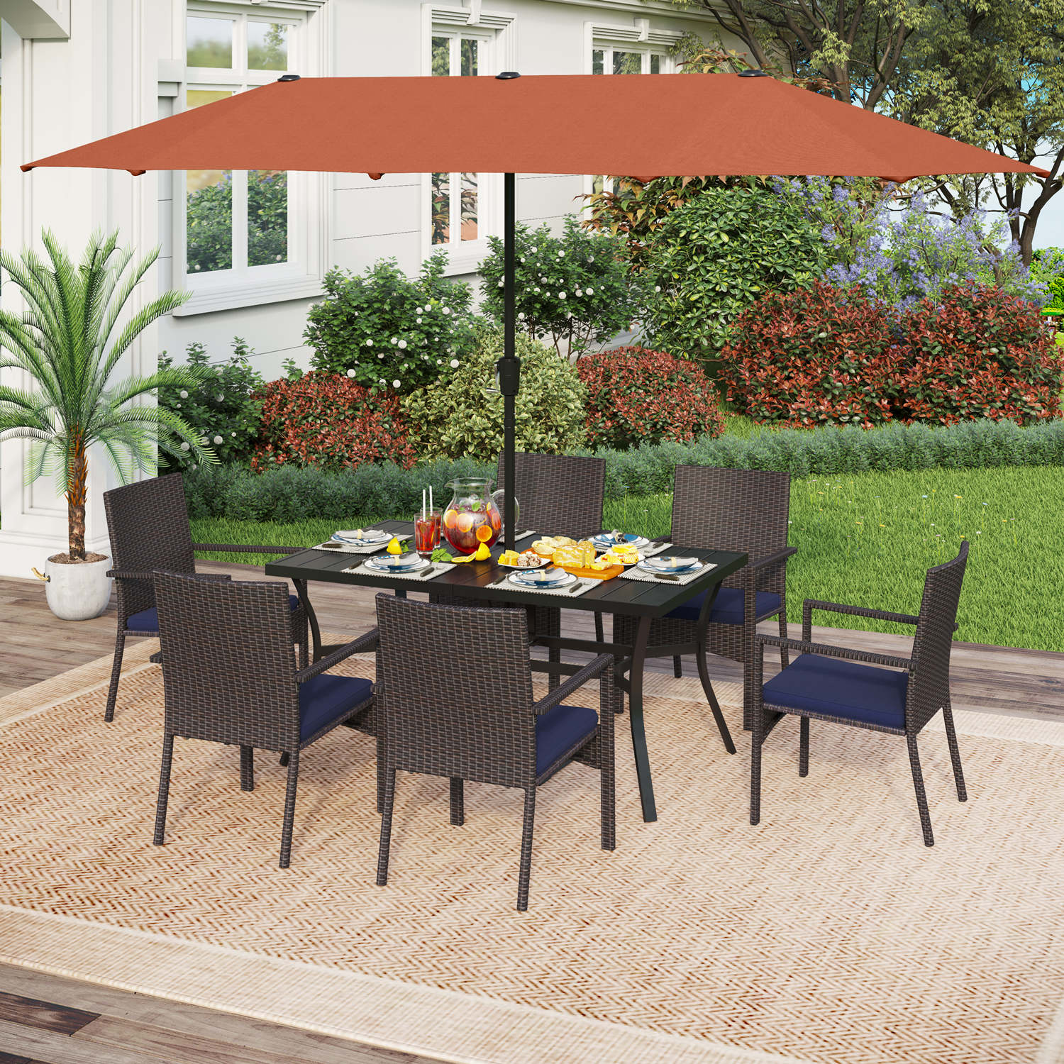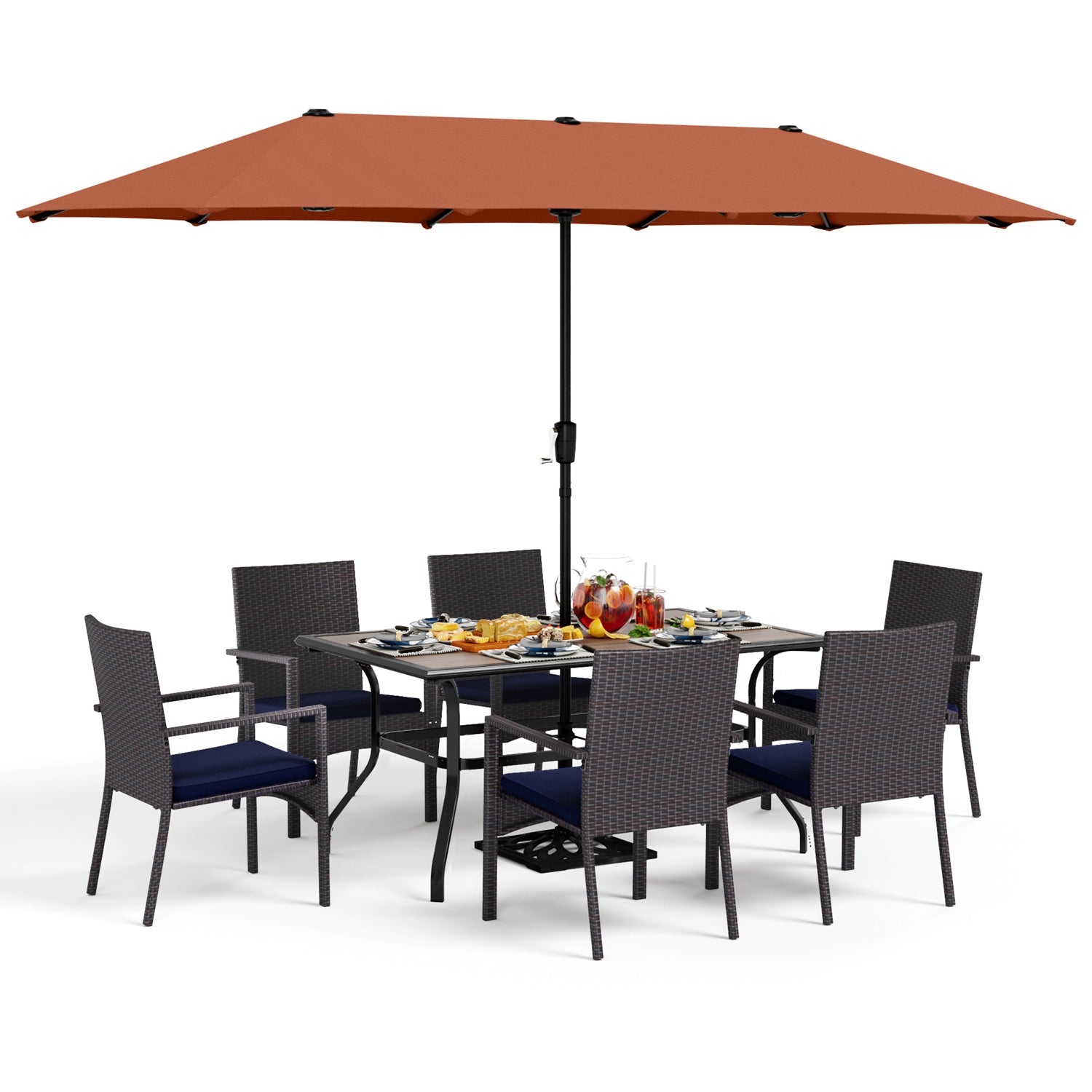 8-Piece Patio Dining Set with 13ft Umbrella & Rectangle Steel Table & Wicker Rattan Chairs