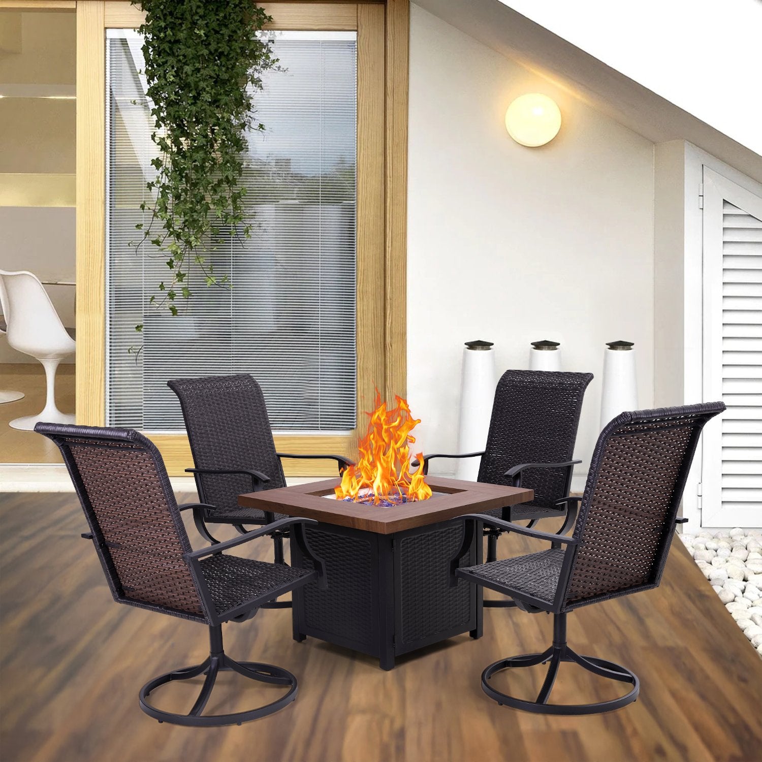 5-Piece Patio Outdoor Fire Pit Set with Rattan Swivel Chairs & Wood-look Square Steel Gas Fire Pit Table