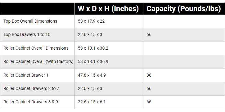 [ 53 INCHES WIDE ] Supplied with a 53 inch wide 10 drawer top box (TC810N) and 53 inch wide 9 drawer full width roller cabinet (TCW809N) with a removable wooden top plate.