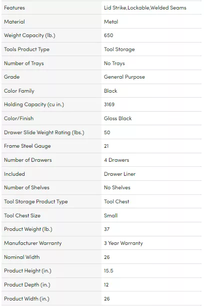 This Husky 26 in. W 4-Drawer Tool Chest is perfect for all of your storage needs. Durable 50 lbs. ball-bearing drawers with smooth detent retention, full width drawer trim, and included drawer liners provide easy access and organization when you need it, while the internal locking system provides security when you are away. Gas struts keep the lid open during use, and a custom Husky embossed stiffener provides extra stability to the lid.
