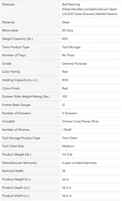 This Husky 36 in. 6-Drawer Tool Chest in Red is great for storing and organizing all your tools and hardware. The chest is made from high grade all welded steel construction and finished with a tough industrial red powder coat paint. 6-Drawers and easily accessible top till provide a total of 8,741 cu. in. of storage capacity. Drawers are all full-extension and glide effortlessly on soft-closing ball-bearing slides that can support up to 100 lbs. The reinforced top lid is supported by gas struts which make it easier to open and close. An integrated power strip with 4 outlets and 2 USB ports allow you to charge your tool or other accessories from within the chest. Recessed aluminum side handles make it easy to lift and move the chest around your work space. The chest also has an internal keyed locking system, with 2 keys provided, for added security.