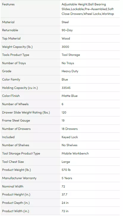 When you buy a 72 in. 18-Drawer Mobile Workbench with Adjustable-Height Solid Wood Top in Matte Blue online from Our Store, we make it as easy as possible for you to find out when your product will be delivered.If you have any questions about your purchase or any other product for sale, our customer service representatives are available to help.Whether you just want to buy a or shop for your entire home, Our Store has a zillion things home.