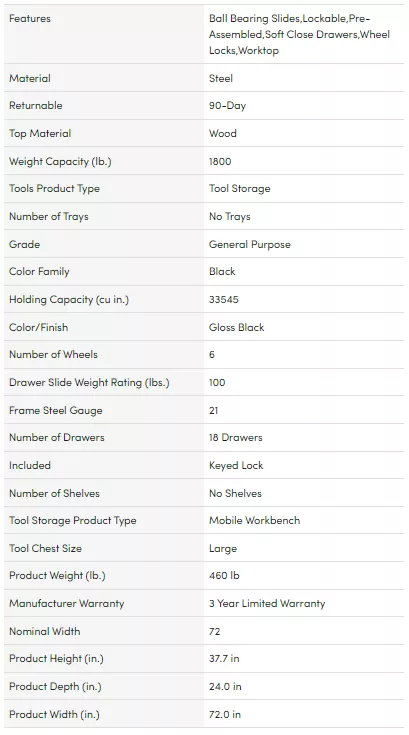 The Husky 72 in. 18-Drawer Mobile Workbench is a tool cabinet that combines the perfect blend of drawer storage capacity and functional work surface area for the tool enthusiast. It is constructed with heavier, 21-Gauge steel. This workbench is 24 in. deep, which is 6 in. deeper than most standard rolling tool cabinets, providing more usable storage space that is strong enough to support 1,800 lbs. and has 33,545 cu. in. capacity. The 1 in. thick solid wood top is sealed with a protective polyurethane coating to protect it from the elements. The workstation is equipped with a power center with 6 outlets and 2 USB ports. Premium drawer liners are included to help keep tools from moving around. Each drawer is equipped with 100 lbs. rated soft closing ball bearing slides. The top long drawer and three bottom drawers are equipped, with double 100 lb. rated soft closing drawer slides for increased weight capacity up to 200 lbs. which enables you to store heavier bulk items. This mobile work center has 6 large, 5 in. x 2 in. all swivel casters and a steel tubular side handle, which allow you to easily move around, even when fully loaded. The Mobile Work Center also has an internal keyed locking system, with 2 keys provided, for added security.