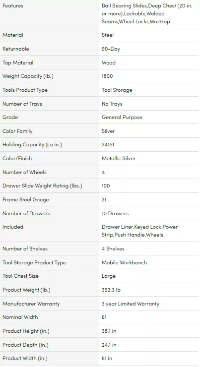 When you buy a 61 in. W 10-Drawer, Deep Tool Chest Mobile Workbench in Metallic Silver with Sliding Vertical Bin Storage Drawer online from Our Store, we make it as easy as possible for you to find out when your product will be delivered.If you have any questions about your purchase or any other product for sale, our customer service representatives are available to help.Whether you just want to buy a or shop for your entire home, Our Store has a zillion things home.