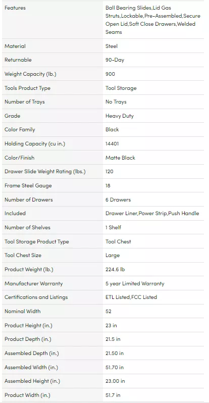The latest generation of the Husky Industrial 52 in. W x 21.5 in. D 6-Drawer Tool Chest has arrived. This chest adds some exciting new features to an already popular design. 1 of new features in this chest is the pull-out wooden work surface in the lower right-hand drawer. This drawer will lock into place when fully-extended to create a work station or place to put a laptop. The wood top is also hinged so you can lift it up to store tools and supplies. Another new feature is the addition of a 550 Lumens LED light bar integrated into the chest lid, which will provide additional lighting to your workspace. The chest is built to last with all-welded 18-Gauge steel construction and is finished with a tough, industrial textured black powder-coat finish. All drawers are full-extension and glide on ball bearing slides that can support up to 120 lbs. These slides also have a soft-close retention system that pulls drawers closed and ensures that they are secured. The reinforced top lid is supported by gas struts, which make it easier to open and close, while the back of the top till has a large magnetic plate that provides storage and quick access to frequently used tools. Also, inside the lid are 12 electrical outlets and 4 USB ports that allow you to securely charge tools and portable devices while unit is locked. Pair this chest with the coordinating 9-drawer cabinet (Model: H52TR9HDV3) to create the ultimate tool storage solution.