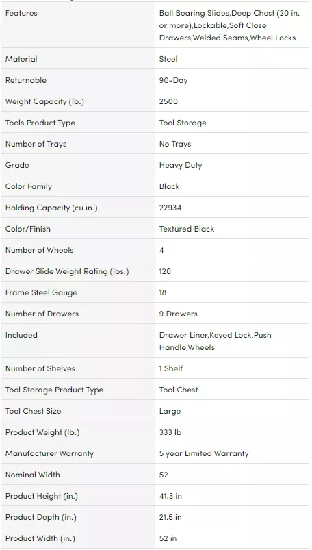 When you buy a Industrial 52 in. W x 21.5 in. D 9-Drawer Tool Chest Rolling Cabinet in Matte Black online from Our Store, we make it as easy as possible for you to find out when your product will be delivered.If you have any questions about your purchase or any other product for sale, our customer service representatives are available to help.Whether you just want to buy a or shop for your entire home, Our Store has a zillion things home.